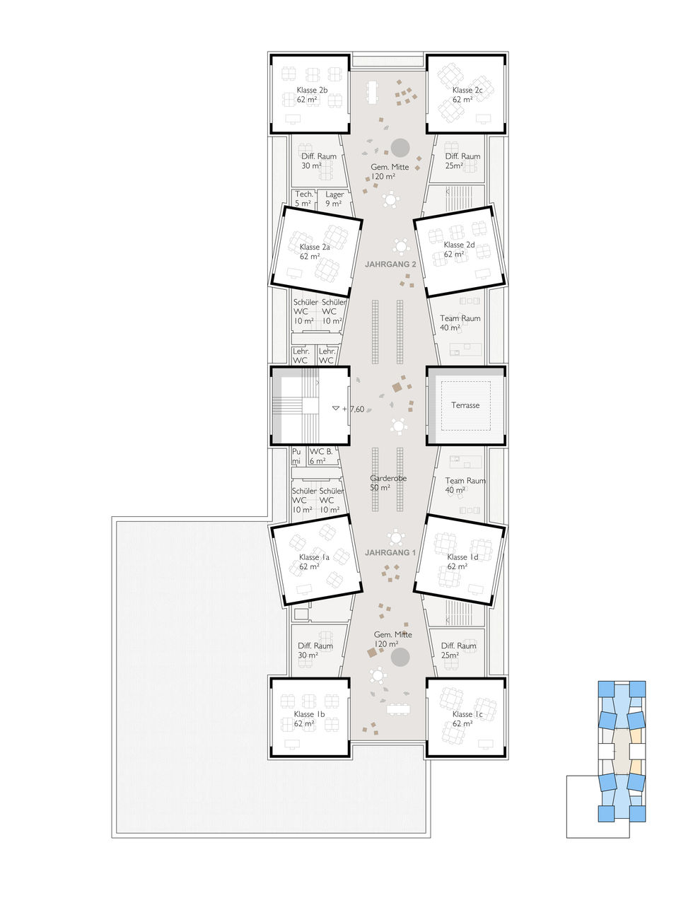 Direkt am Foyer befindet sich auch die zentrale Treppenanlage, die den allgemeineren Bereich im Erdgeschoss mit den individuelleren Lernclustern in den Obergeschossen verbindet. Hier finden sich jeweils zwei offene Raumcluster. Der zusätzliche Klassenraum wird im 1. Obergeschoss mittig zwischen zwei Clustern angeordnet, dies ermöglicht bei Nichtbelegung eine vielfältige Nutzung auch für andere Klassen. Im darüber liegenden Geschoss wird dieser Raum als Terrasse ausgebildet und kann als Freiluftklasse genutzt werden.